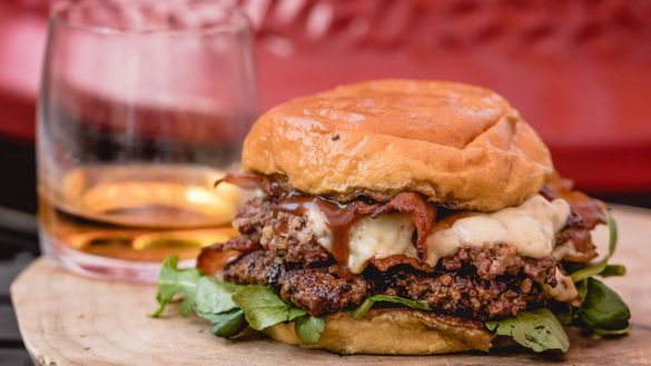 After 2 minutes, place a slice of cheese onto each patty then pour a splash of whisky next to it, before covering with a burger dome. This will accelerate the melted cheese and infuse the patty with a whisky steamed flavour.